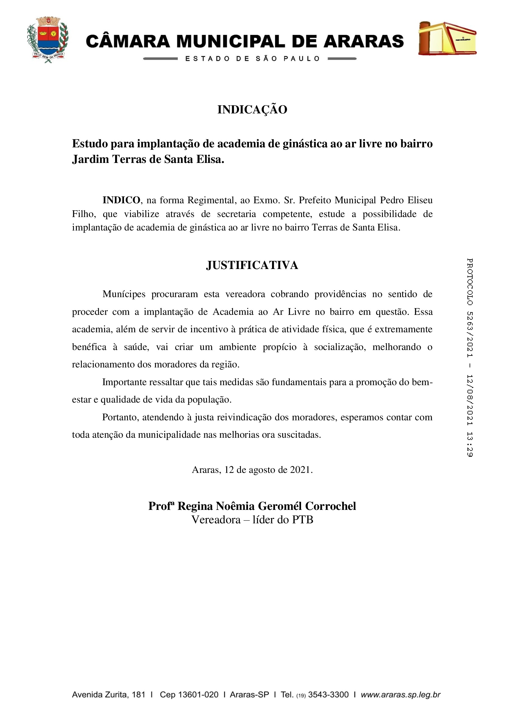A vereadora Regina Corrochel, encaminhou uma indicação (veja abaixo) ao prefeito Pedrinho Eliseu, para que ele viabilize através de secretaria competente, estude a possibilidade de implantação de academia de ginástica ao ar livre no bairro Terras de Santa Elisa em Araras (SP).