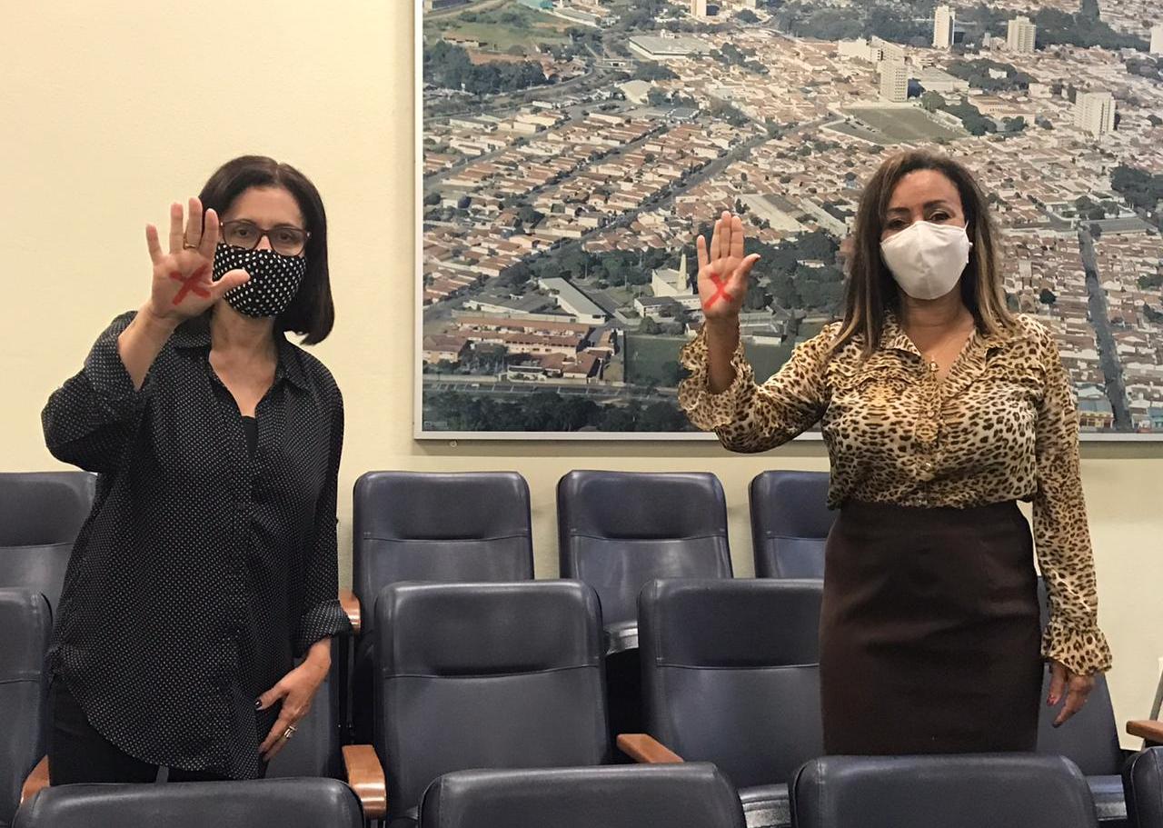 As vereadoras Regina Noêmia Geromél Corrochel (PTB) e Anete Monteiro dos Santos Casagrande (PSDB) demonstram o seu apoio à campanha que tem como objetivo prevenir a violência doméstica e familiar durante a crise sanitária decorrente da pandemia da Covid-19.