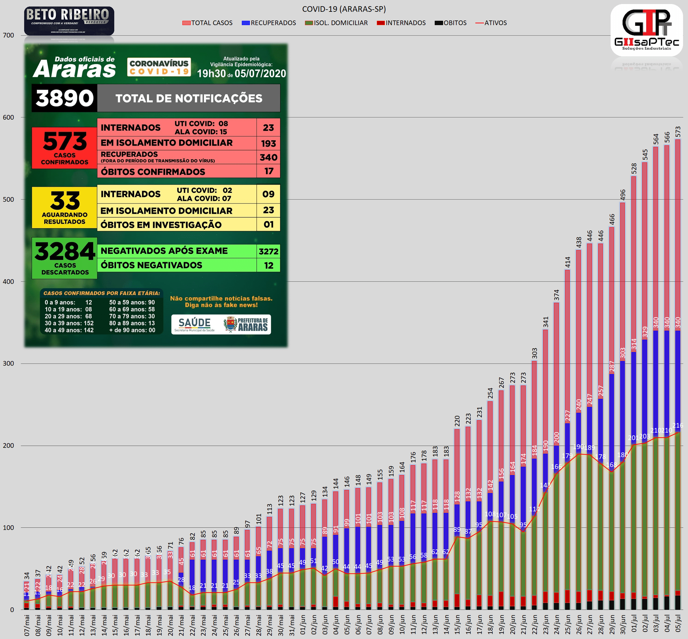 Segundo o último balanço epidemiológico, a cidade registra 573 casos confirmados da doença provocada pelo novo coronavírus (Sars-CoV-2). Entre os ararenses que testaram positivo, há 23 internados atualmente – oito deles na UTI e 15 na enfermaria covid, somando dados da Santa Casa de Misericórdia e do Hospital Unimed.