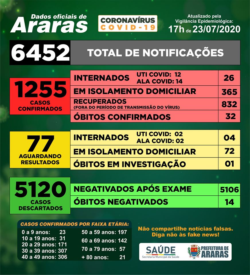 A Vigilância Epidemiológica de Araras (SP) confirmou mais uma morte em decorrência da covid-19 nesta quinta-feira (23) e, com ela, a cidade chega a 32 óbitos relacionados à doença.
