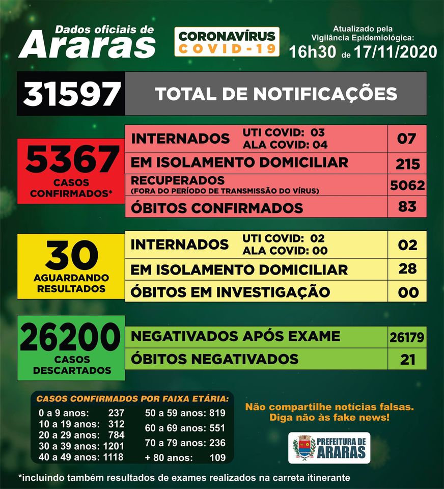 A Vigilância Epidemiológica de Araras (SP) confirmou mais duas mortes em decorrência da covid-19 e, com ela, a cidade chega a 83 óbitos relacionados à doença desde o início da pandemia, em março deste ano.