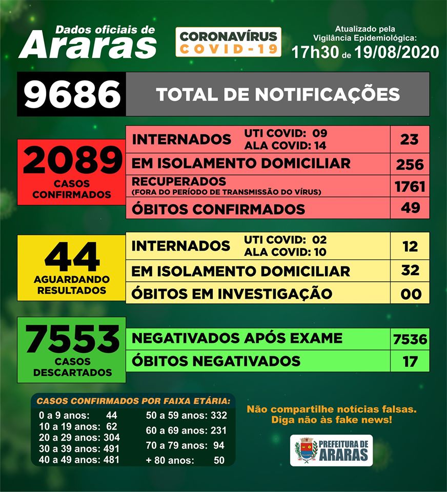 Segundo o último balanço epidemiológico, Araras registra 2.089 casos confirmados da doença provocada pelo vírus. Entre os ararenses que testaram positivo, há 23 internados atualmente – nove deles na UTI e 14 na enfermaria covid, somando dados da Santa Casa de Misericórdia e do Hospital Unimed.