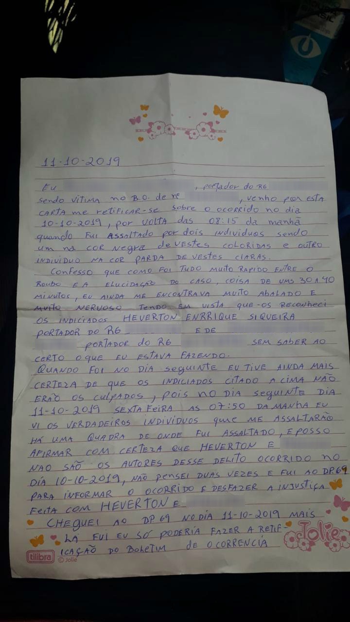 Sem sucesso com a Polícia Civil, o homem escreveu uma carta de próprio punho, reconheceu firma em cartório e entregou para a família buscar justiça. Até agora, algo que não conseguiu. “Confesso que, como foi tudo muito rápido entre o roubo e a elucidação do caso, coisa de uns 30 a 40 minutos, eu ainda me encontrava muito abalado e muito nervoso. Tendo em vista que os reconheci […] sem saber ao certo o que eu estava fazendo”, escreveu na carta.
