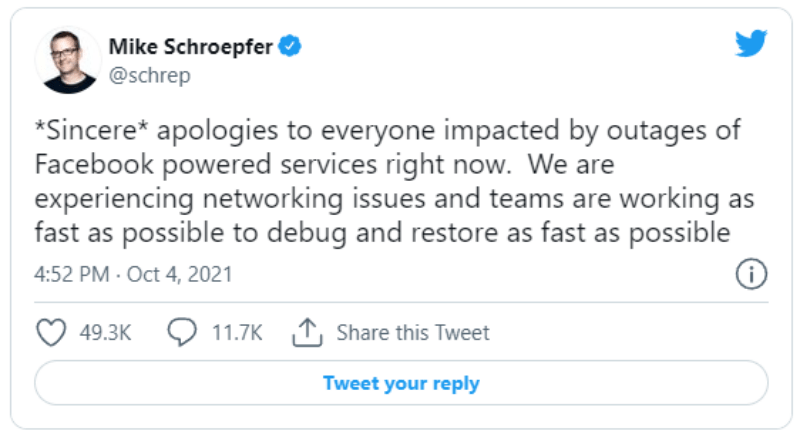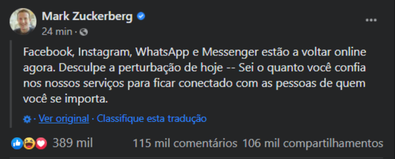 A falha nas três das maiores redes sociais do mundo prejudicou trabalhadores e estudantes, se tornando o assunto mais falado no Twitter durante toda a tarde – a página se tornou o principal canal de comunicação, sendo usada inclusive, pelo Facebook para atualizar a situação. Mark Zuckerberg, usou seu perfil no Facebook, 24 minutos após sua volta, para se desculpar. Veja abaixo: